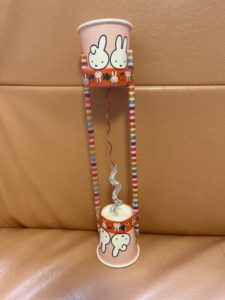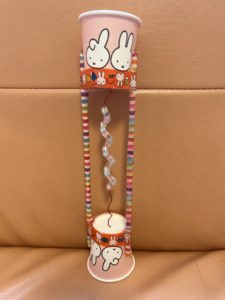 100均などで気軽に手に入る材料(紙コップ、割り箸、マスキングテープ、針金、ストロー)でとても可愛くできました。今回はストローを短く切って針金に通してみましたが、ビーズを通しても可愛いと思います。